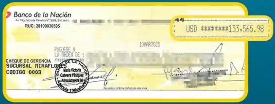 El juzgado admito el embargo en forma de retención sobre las cuentas bancarias y acreencias del deudor, posteriormente la empresa minera puso a disposición del juzgado el dinero retenido, y el juzgado emitió la orden de pago a favor de nuestro cliente, canjeando el mismo por el cheque de gerencia que se aprecia a continuación: